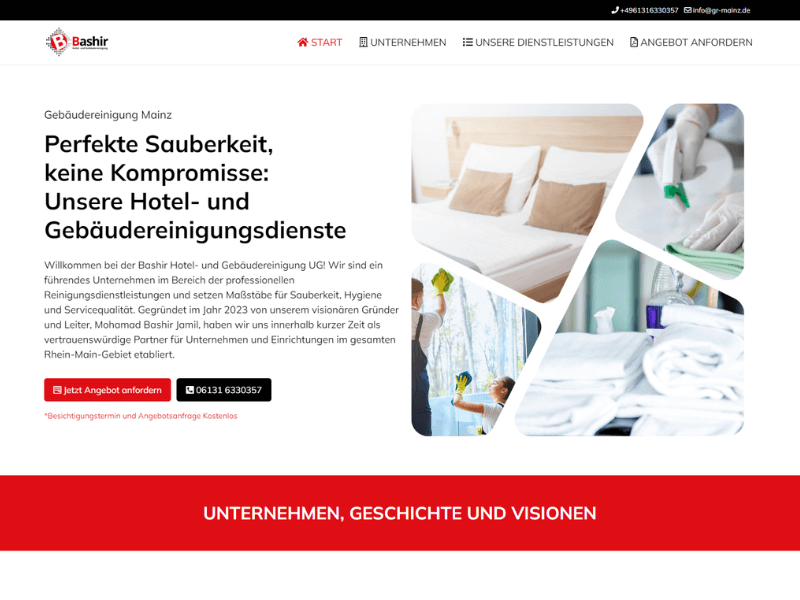 Bashir Hotel- und Gebäudereinigung UG in Mainz bietet umfassende Reinigungsdienste, darunter Büro-, Hotel- und Unterhaltsreinigung. Das Unternehmen setzt auf umweltfreundliche Reinigungsmittel und erfahrenes Personal für höchste Sauberkeit und Hygiene.
