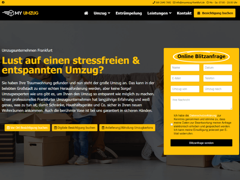 MyUmzug Frankfurt bietet professionelle Umzugsdienste für private und gewerbliche Kunden. Das Unternehmen organisiert den gesamten Umzug, inklusive Verpacken, Transport und Montage, mit einem Fokus auf Zuverlässigkeit und fairen Preisen.